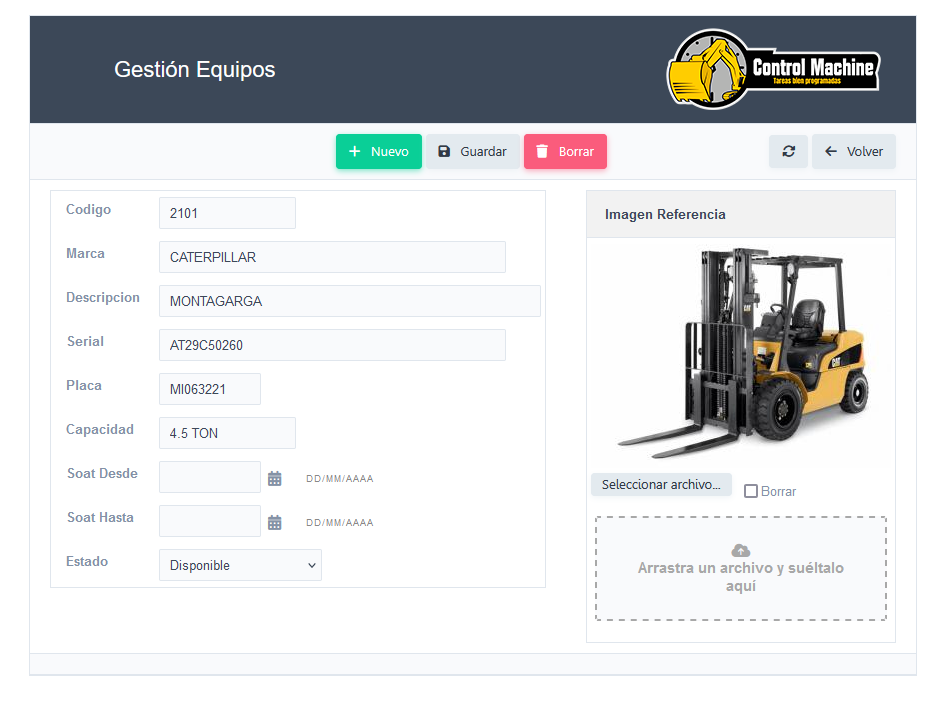 Registre la información correspondiente a la maquinaria que destinara para el control y administración.